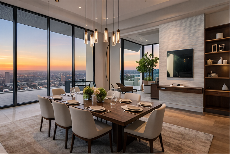 • Diseño Integrado: Una cocina gourmet con isla de cuarzo que fluye orgánicamente hacia la estancia principal y el comedor de gala.